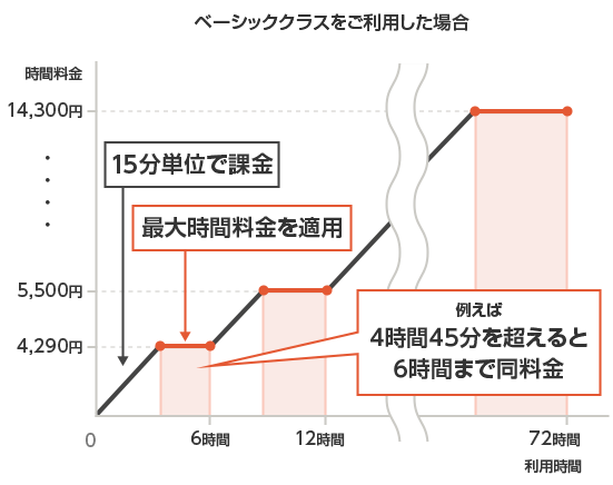 6時間までは最大料金で4290円で利用することができます。ちなみに、6時間を超えると、20 円/kmの距離料金がプラスされます。
