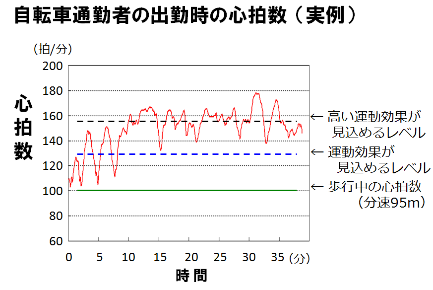 また、以下に平均37歳の自転車通勤男性10名に行った調査で、歩行時の心拍数と自転車通勤時の心拍数を比較したグラフがあります。自転車に乗ることが高い運動効果を示していることがわかるかと思います。